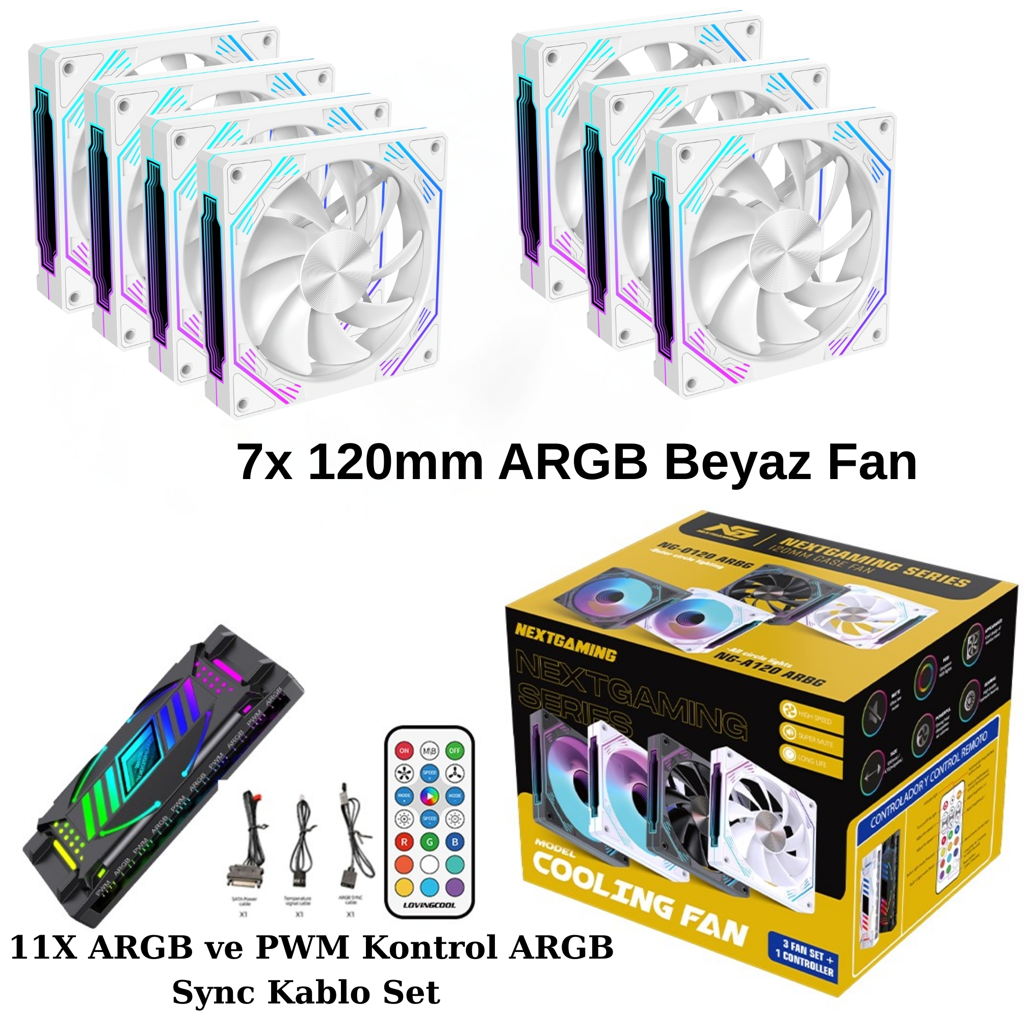 NG-O120W 7 Adet 120mm ARGB Fan 11X ARGB PWM Slot Kontrolcü ve Kumanda Beyaz